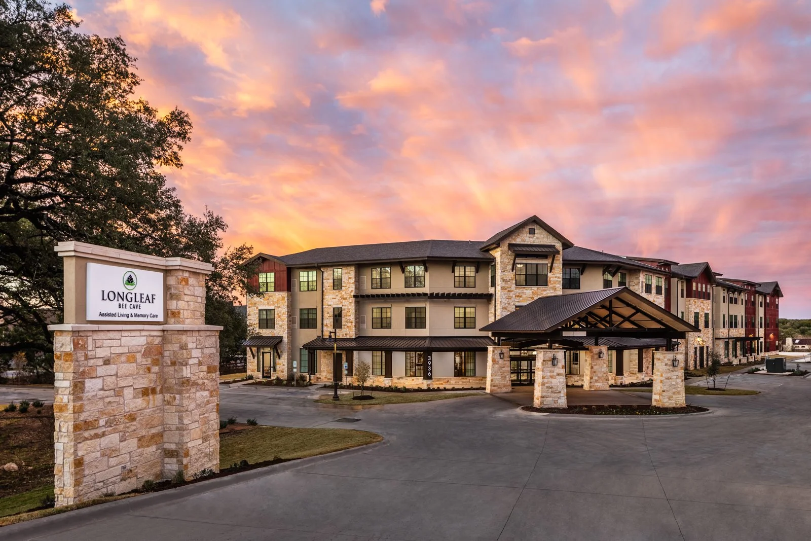 Woven into the community fabric, Longleaf Bee Cave provides a relaxed, walkable living environment. A warm greeting awaits residents and guests within a bright, airy lobby area. The modern Hill Country atmosphere continues with multiple spaces to meet with friends and family: a sports lounge and game room; outdoor patios with scenic views; a café; and a library with fireside reading areas and computer workstations. Other amenities include a salon, a fitness center, and a creative arts studio.