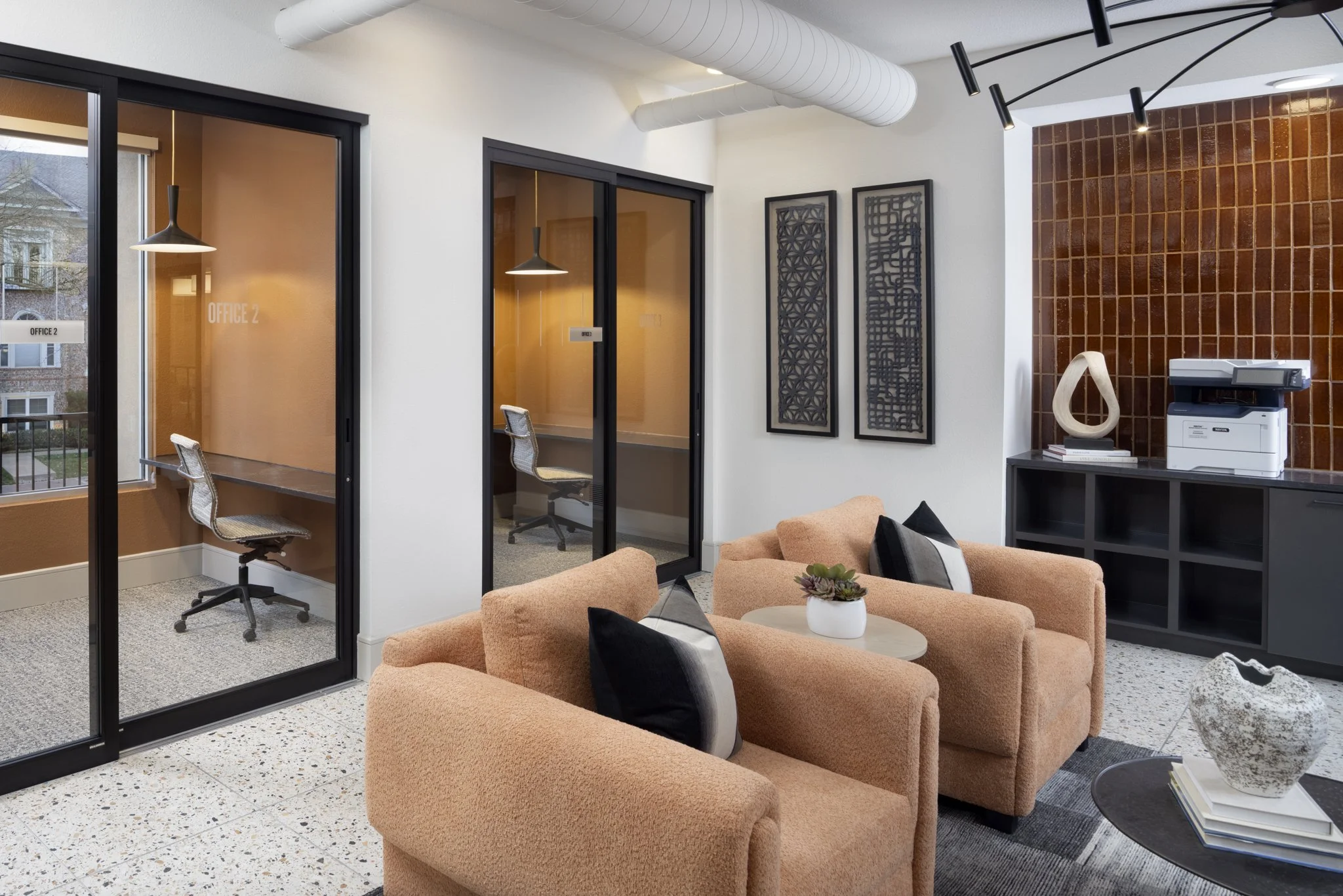 The renovation strategically repurposed existing spaces to meet contemporary needs. On the first floor, the former sports court was transformed into new residential units, while a Craftwork Coffee bar was added to elevate the arrival experience. The leasing office retained its original layout, maintaining continuity for residents.