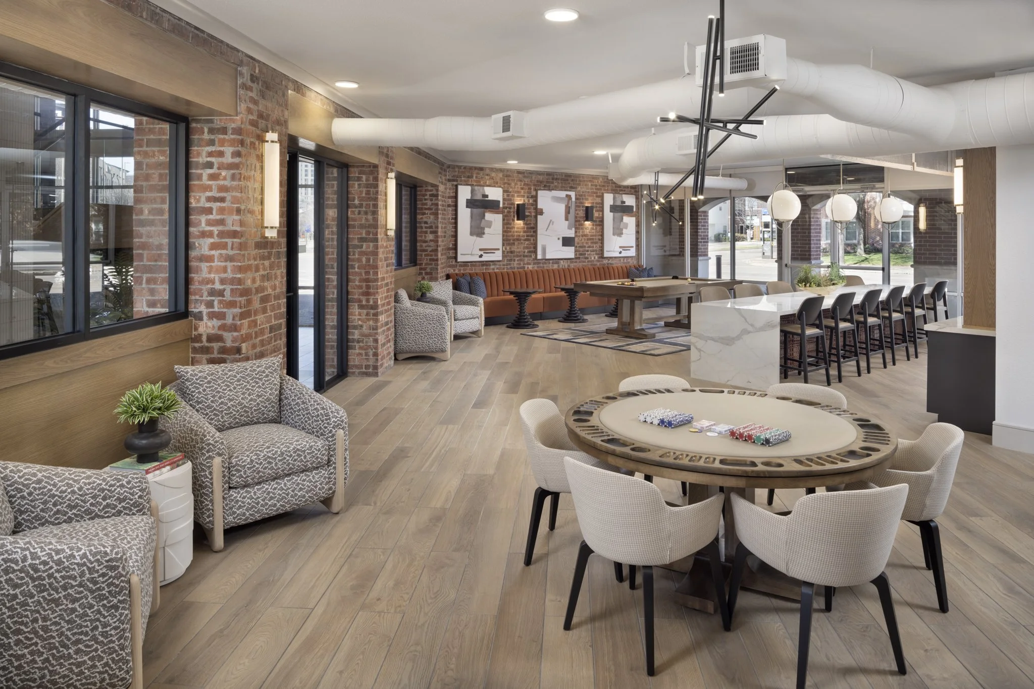 The second floor was fully redesigned to create a cohesive amenity level. New features include a modern fitness center, a vibrant community workspace, and a welcoming clubroom, all thoughtfully arranged to encourage social connection and support a balanced lifestyle.